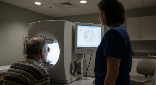 Visual Field Testing: Detects peripheral vision loss. You look at a central point and click when you see lights appear. Shows if glaucoma is affecting your side vision. About 5-10 minutes per eye.